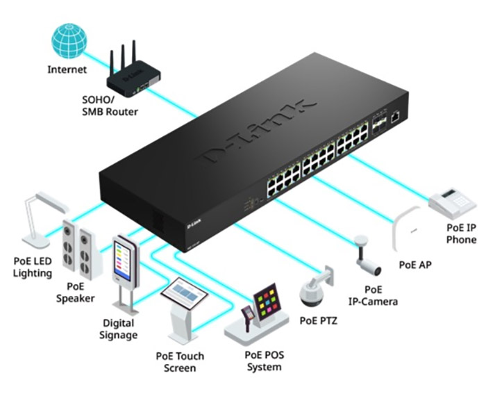 The DMS-1250 Series switches are versatile and particularly suitable for SMB environments. They provide high-speed data transmission with 2.5GE to desktops and infrastructure devices, whilst providing crucial 10G uplinks for external connectivity. This high-speed uplink ensures that the entire business can access external services without encountering data bottlenecks. Furthermore, they offer IEEE 802.3af/at (PoE/PoE+) to power remote devices.